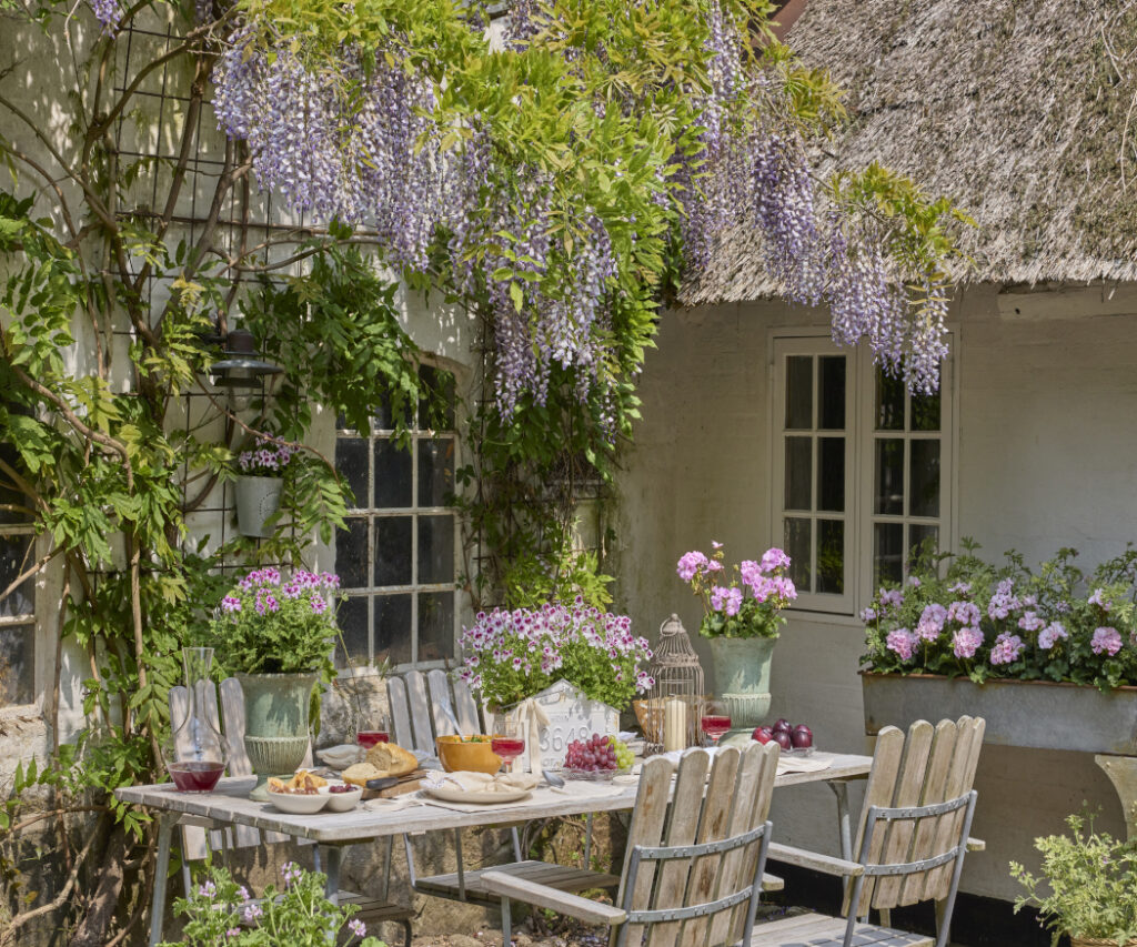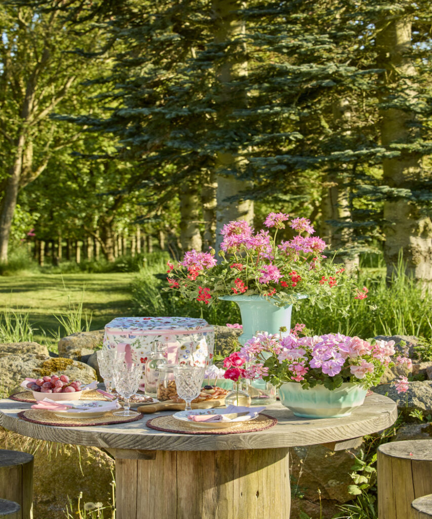 Letnie stoły w stylu cottage to miła odskocznia od codzienności, przywołująca nostalgię i sielską, wiejską atmosferę dzięki swojemu romantycznemu urokowi. Pelargonie doskonale wpisują się w tę estetykę.