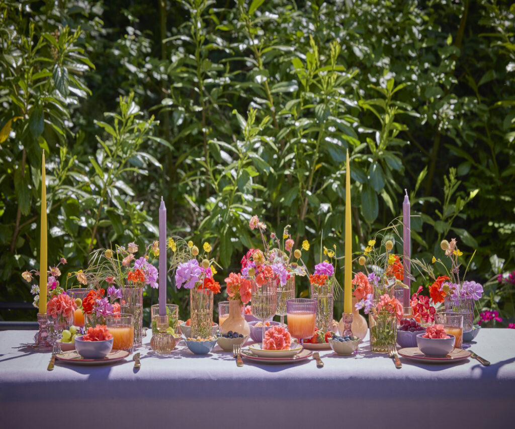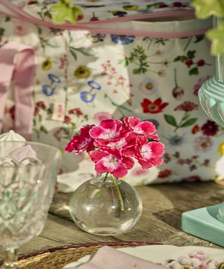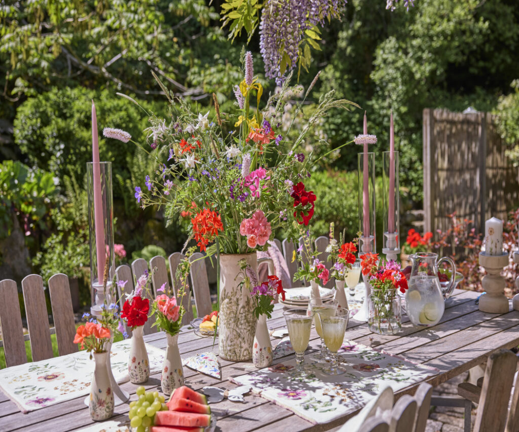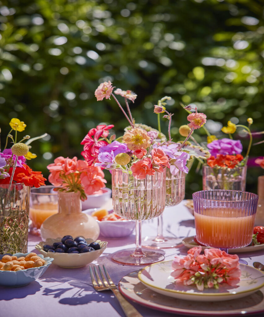 Kolorowa, radosna i pełna letniego uroku, aranżacja po lewej stronie to czysta przyjemność – idealna na garden party. W dużym wazonie znajdują się cięte pelargonie, trawy, rdest wężownik (Persicaria bistorta 'Superba’), dziewanna fioletowa (Verbascum phoeniceum), irys (Iris pseudacorus), bodziszek żałobny (Geranium phaeum 'Samobor’), bodziszek łąkowy (Geranium pratense), niezapominajka leśna (Myosotis sylvatica) oraz orlik pospolity (Aquilegia vulgaris), tworząc wspaniały, sielski bukiet. Małe wazoniki z pojedynczymi kwiatami dodają dodatkowych akcentów i zachęcają do spędzania godzin na świeżym powietrzu.