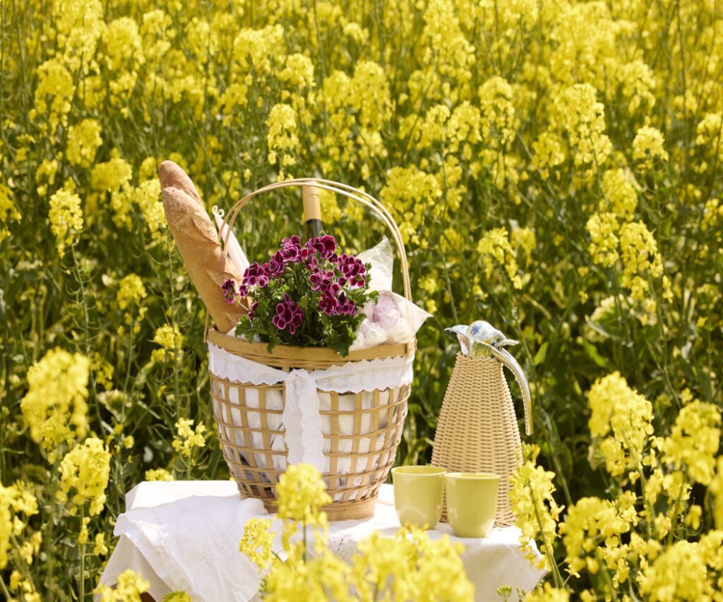 Piknik na tle kwitnącego pola rzepaku pozwala poczuć bliskość natury i wprowadza letni nastrój. (Po lewej) Starannie przygotowany stół piknikowy z kawą, bagietkami i owocami zachęca do relaksu i cieszenia się chwilą.