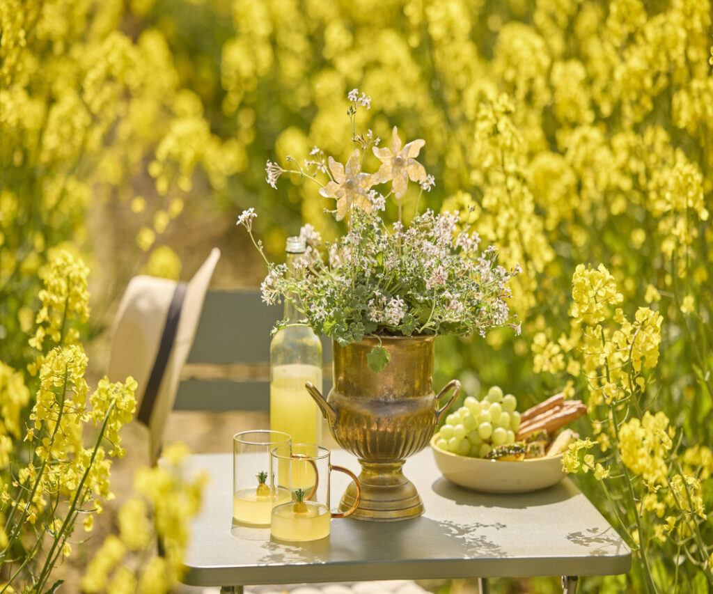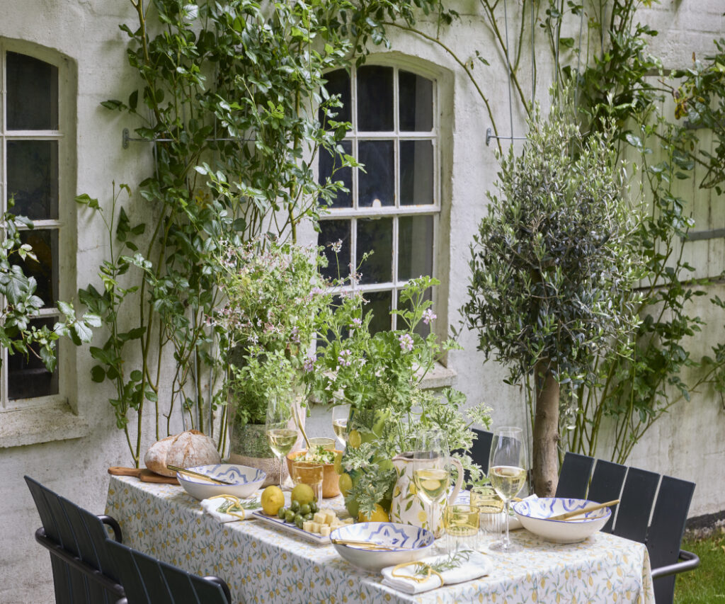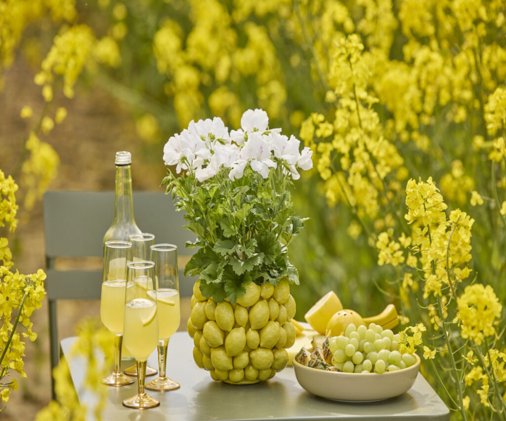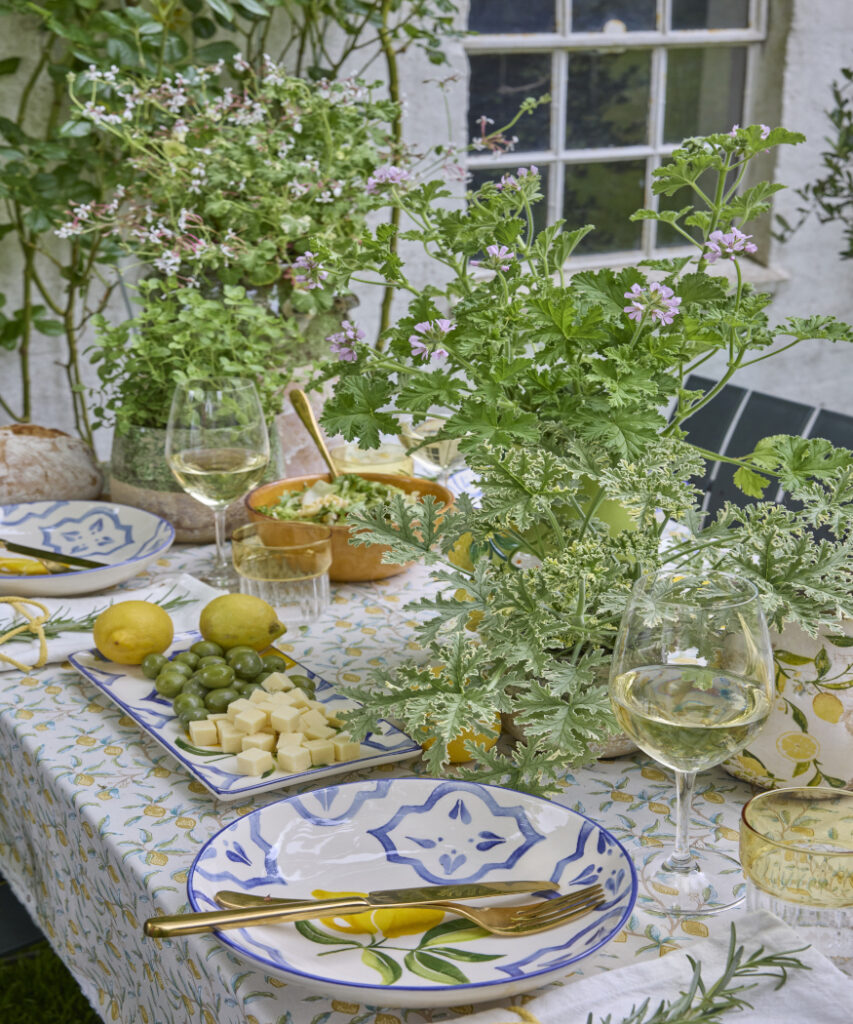 Tutaj pelargonie pachnące uwalniają świeże aromaty, a w połączeniu z cytrynami, oliwkami i białym winem tworzą letnią aranżację stołu – lekką, beztroską i pełną śródziemnomorskiej radości.