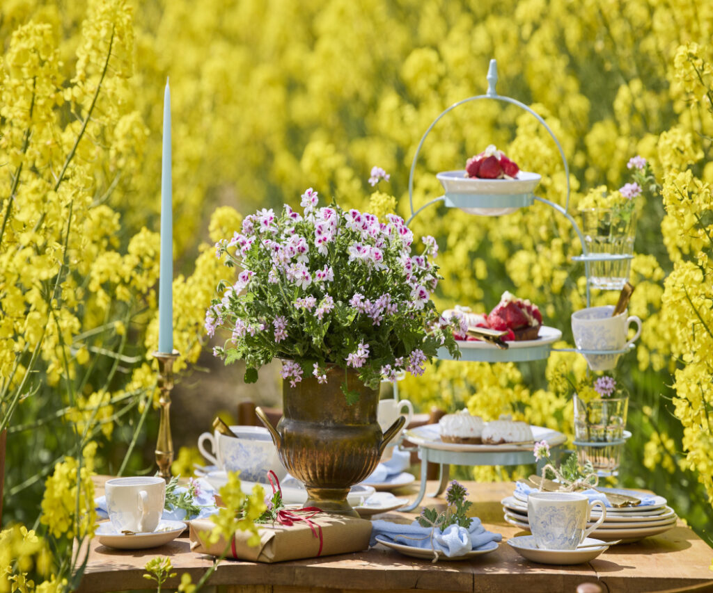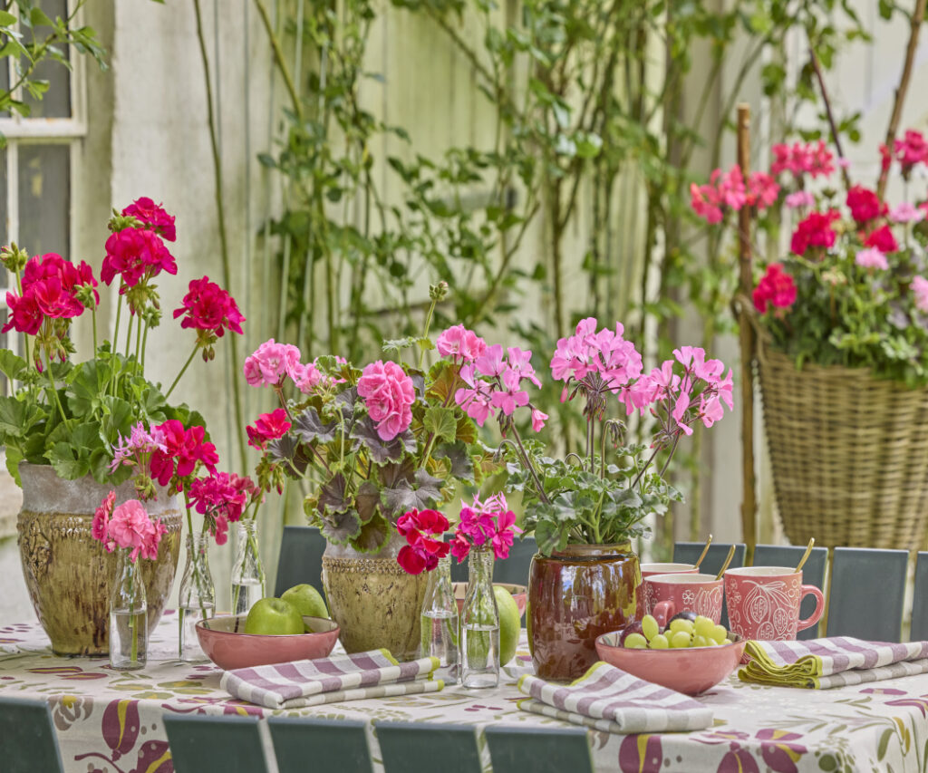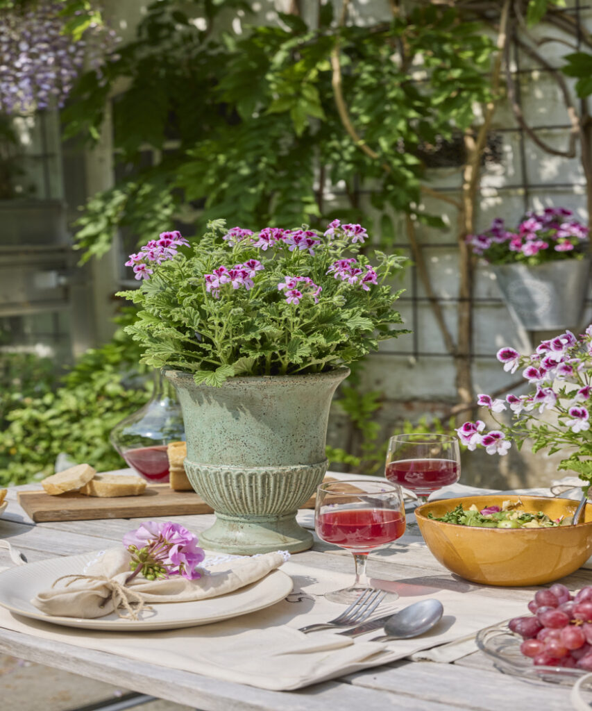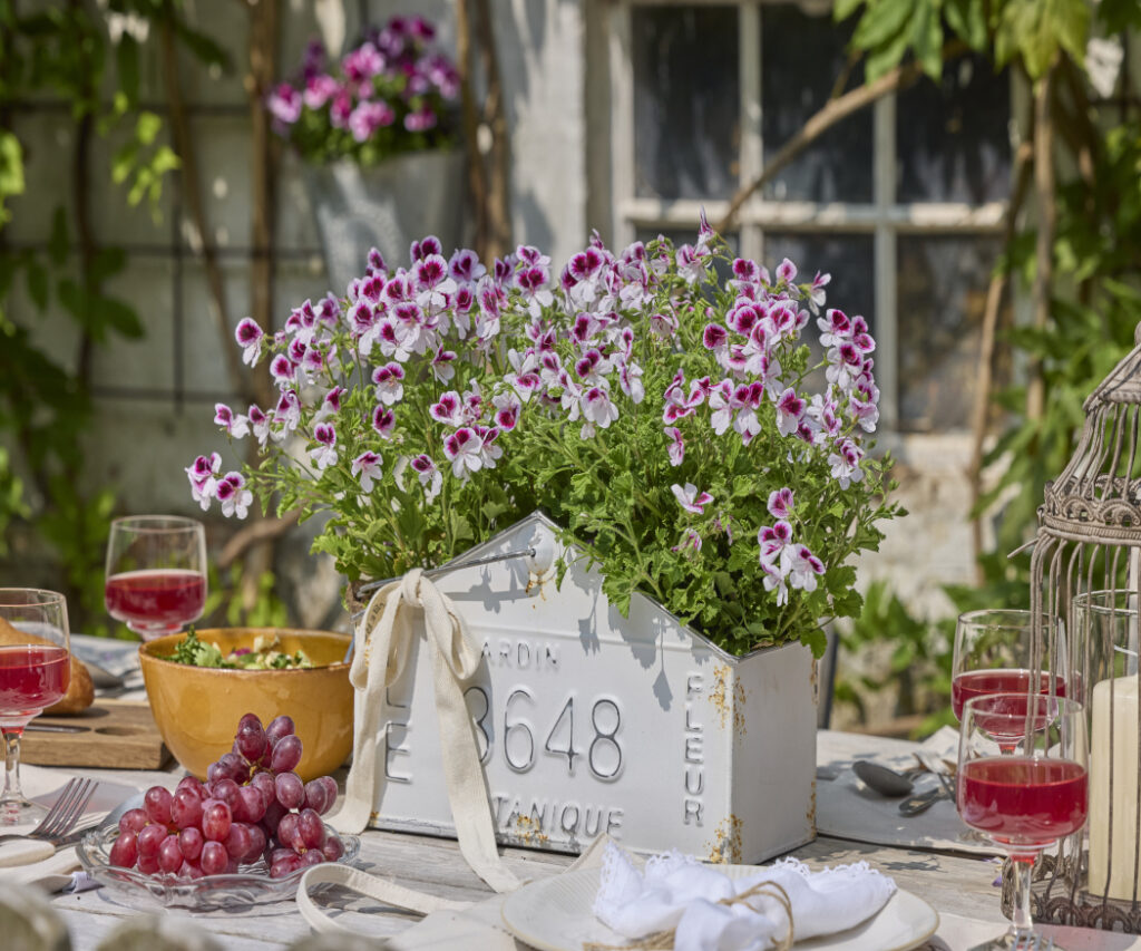 Kwitnące pelargonie pachnące prezentują swoje piękno w donicach w stylu vintage – cynkowych lub ceramicznych. Efektowne kwiaty na stole wprowadzają romantyczny akcent do posiłków na świeżym powietrzu i ożywiają letnią atmosferę.