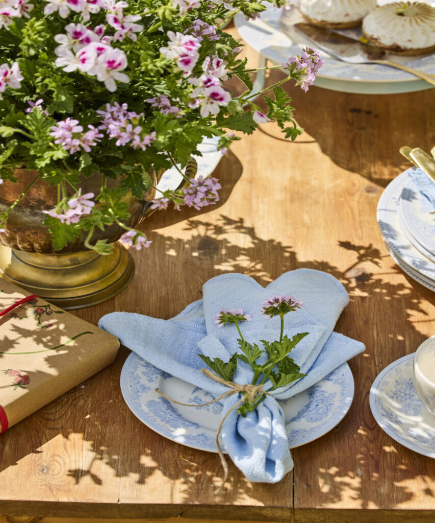 Stół urodzinowy po lewej to prawdziwa letnia sceneria: w centralnym miejscu, w vintage’owym wazonie dumnie prezentuje się pelargonia angielska, obok niej starannie zapakowany prezent, elegancka porcelana, domowe wypieki, świeca oraz cięte pelargonie, które dopełniają całość aranżacji.