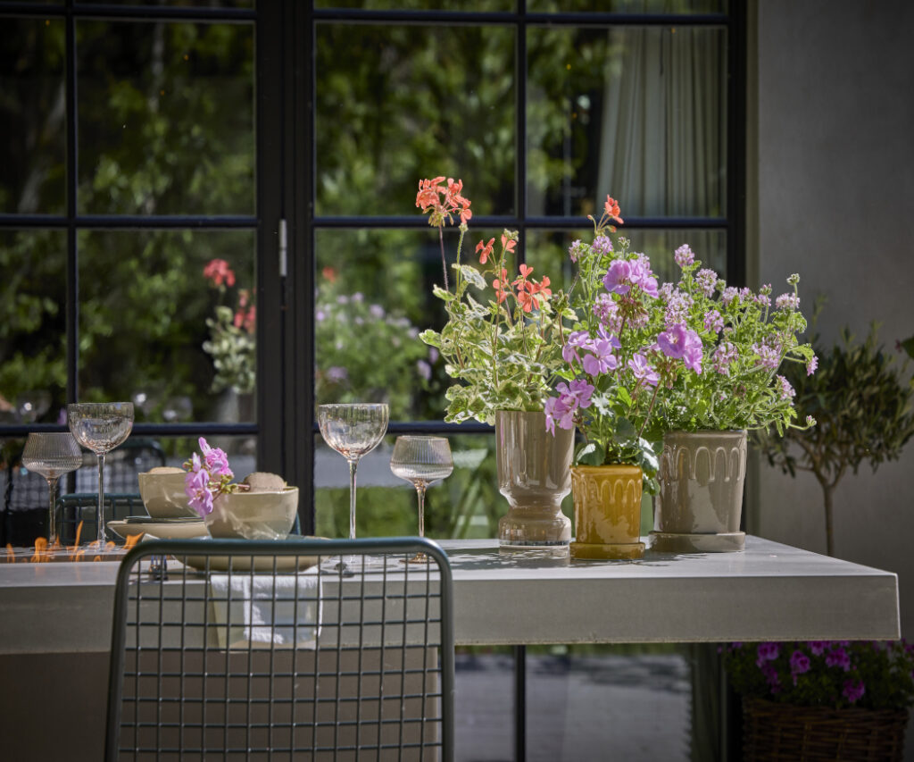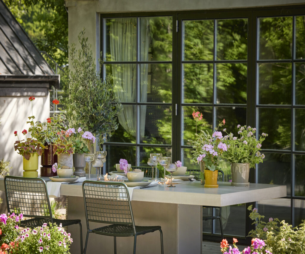 Nowoczesne stoły łączą prostotę i elegancję dzięki czystym liniom, minimalistycznym formom i naturalnym materiałom. Pelargonie wprowadzają żywy kontrast, dodając kolor, lekkość i letni akcent dzięki swoim kwiatom.
