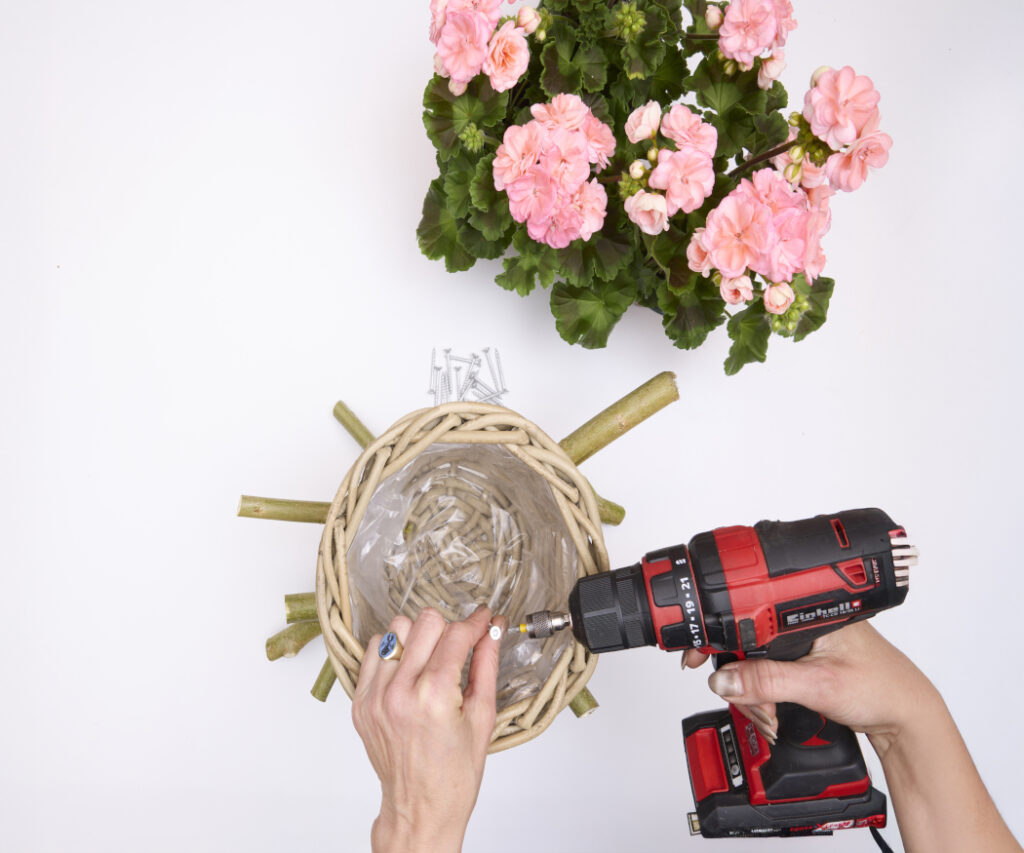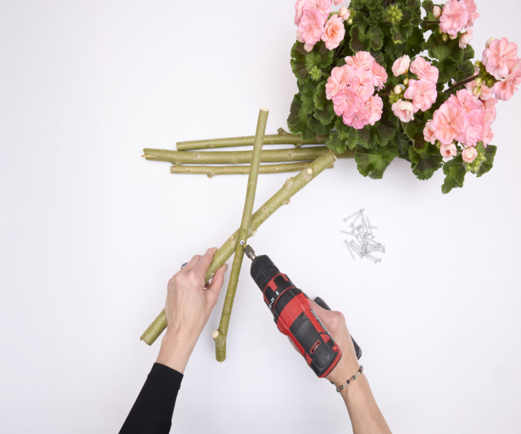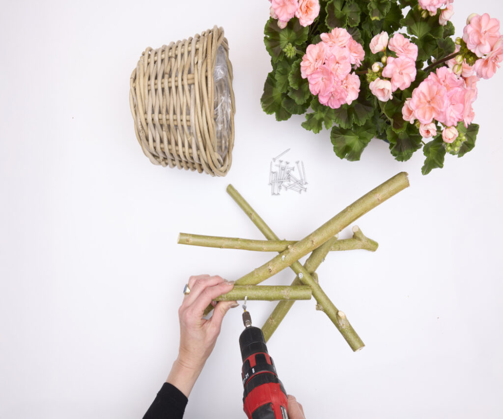 Do wykonania potrzebne są: 3 proste gałęzie o długości ok. 40 cm, 3 krótsze gałęzie o długości ok. 20 cm, kosz, wkrętarka bezprzewodowa, wkręty oraz kwitnąca pelargonia.