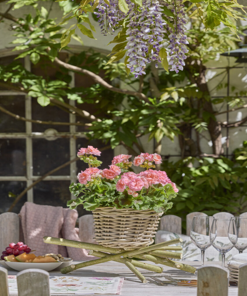 Na koniec ostrożnie umieść kwitnącą pelargonię w koszu, a następnie ustaw gotowy stojak na kwiaty na stole, tworząc naturalny punkt centralny aranżacji